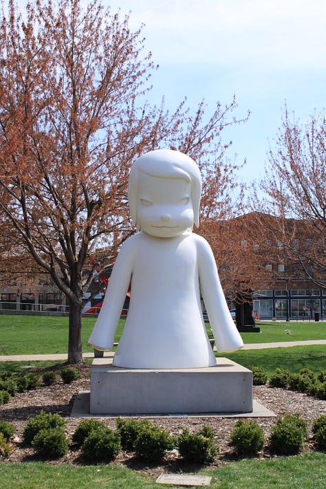 One of my regular families lived south of Grand Avenue on Foster Drive. If you have never driven in the south of Grand neighborhoods, you are missing out. There are beautiful, stately old homes with so much character; it is worth the drive. Every time I would drive to their house from work, I passed a house with huge sculptures in the front yard. If I saw this today, I would certainly pull over and take a picture with my phone, but it was 1999 and a smart phone with a camera was not in my future for another ten years or so. My memory is vague but I remember thinking it was a bit strange that this house had an angry bunny sitting on a rock and a giant spider sculpture in the front yard. I knew the people who lived there must be very interesting and when I asked the family I nannied for who owned these, they told me the homeowners were John and Mary Pappajohn.